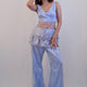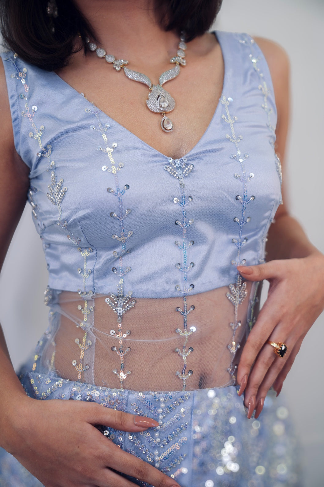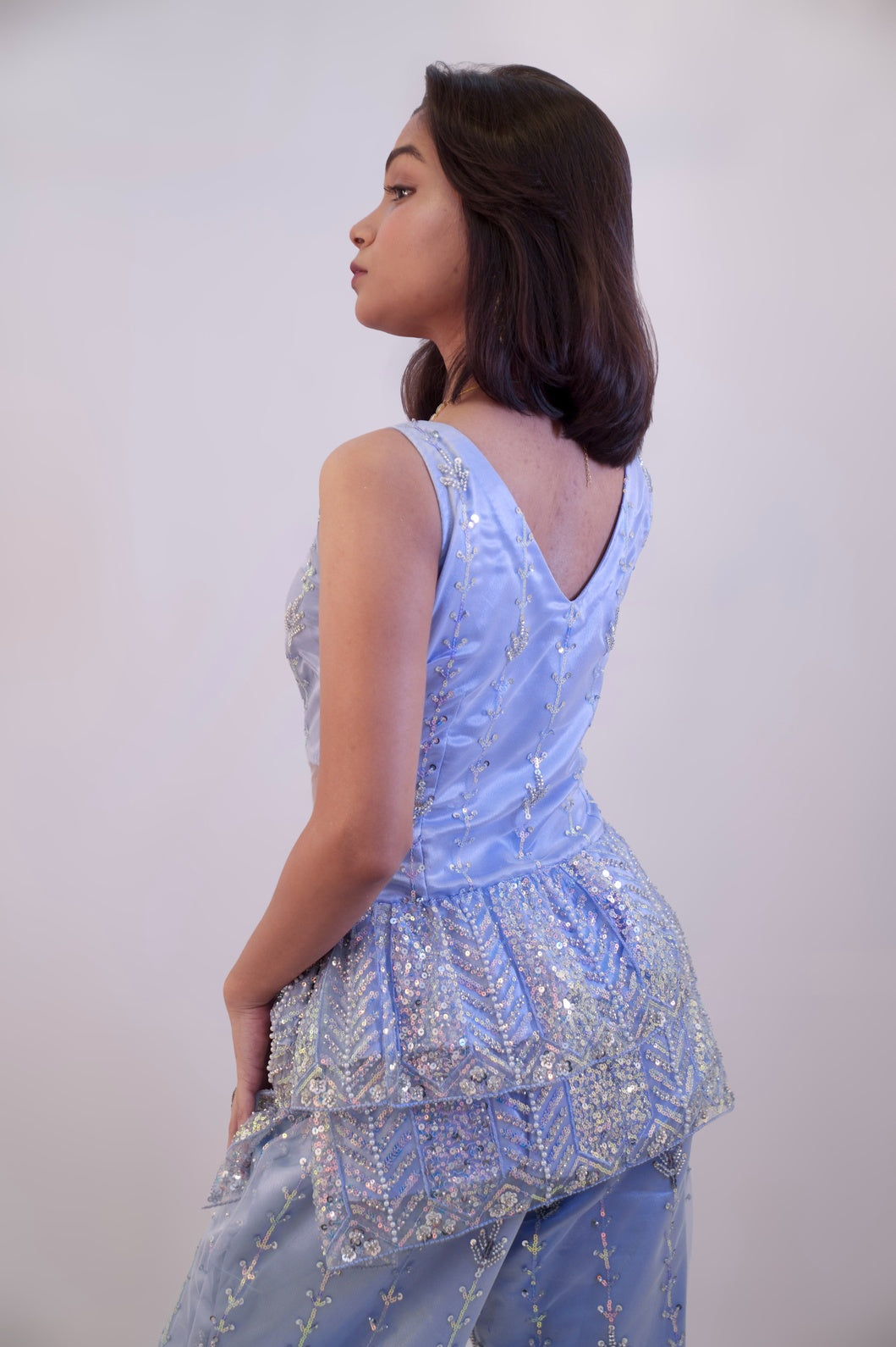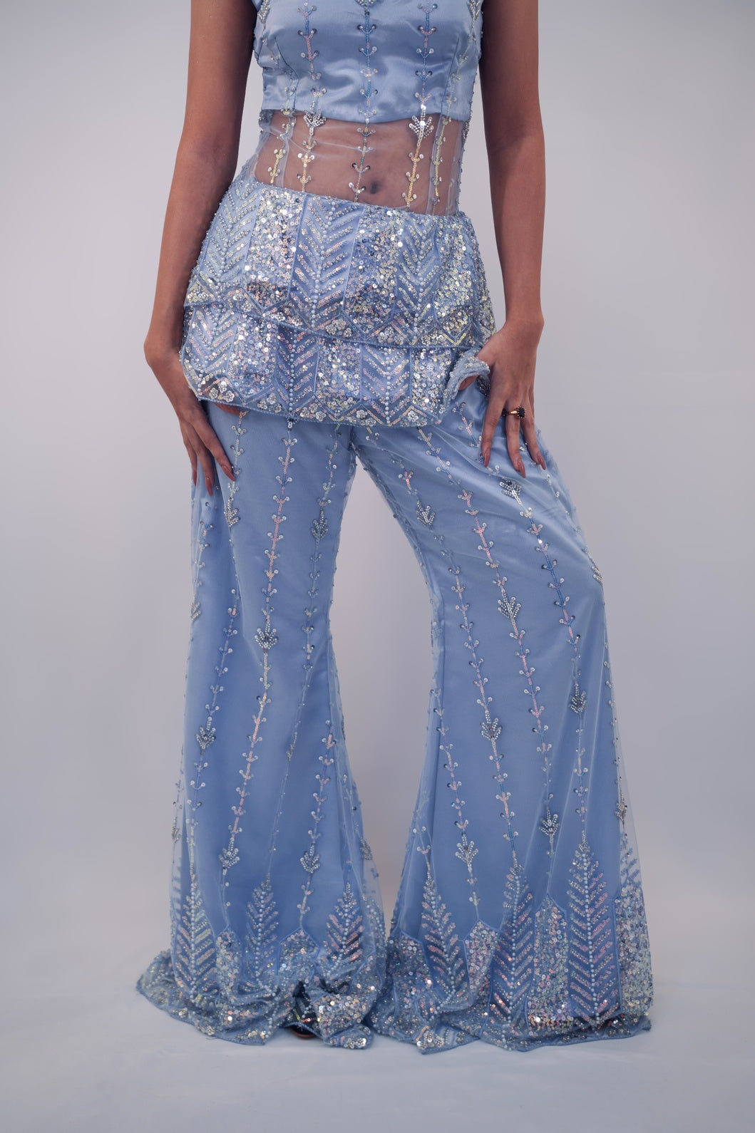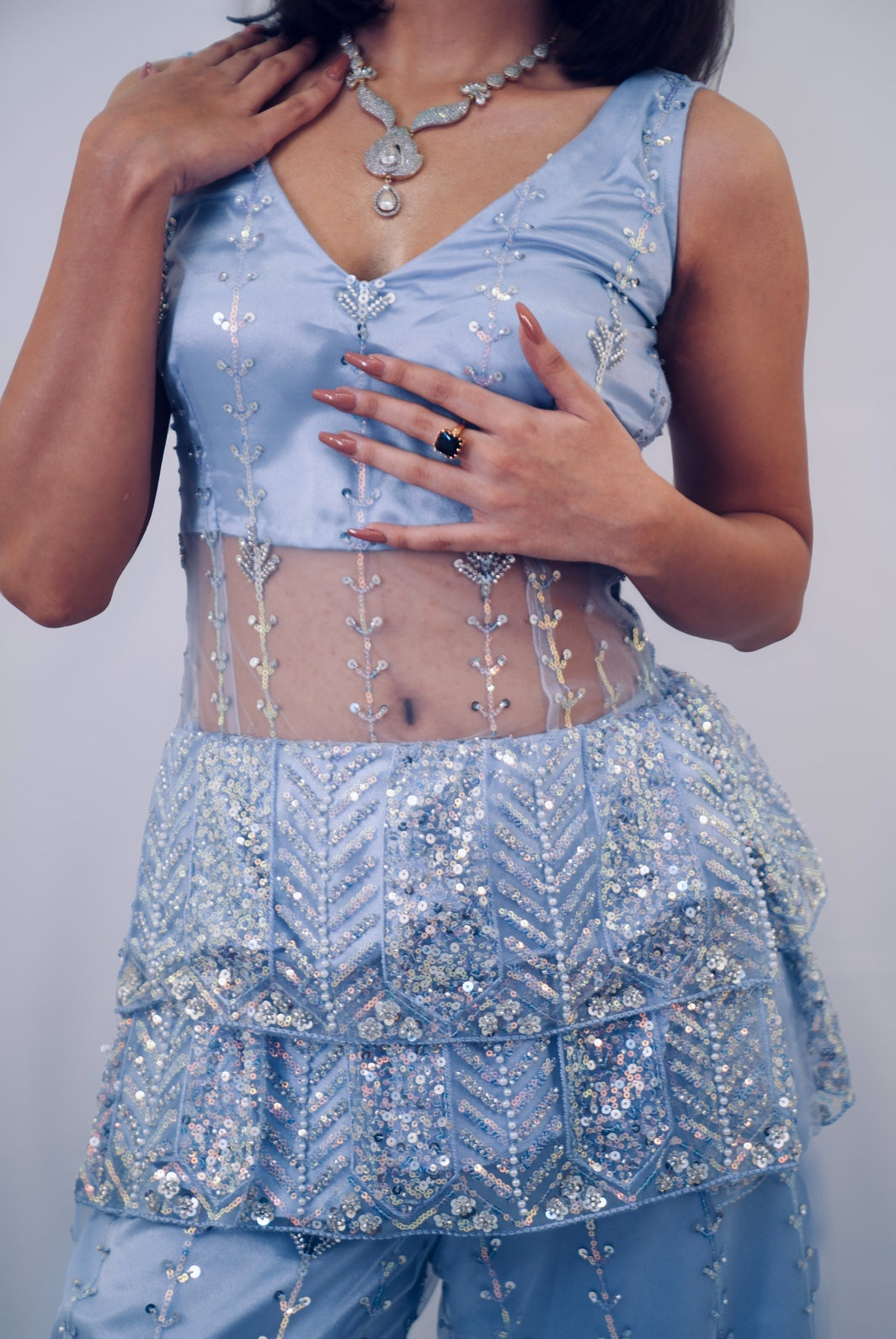 A fun indo western top with corset and ruffle details paired with sharara and adorned with intricate threadwork, delicately hand- embellished and framed in net and luxurious pastel cobalt satin.
