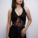 The sculpted corset features intricate threadwork, delicately hand- embellished and framed in net and luxurious black satin. Paired with a fluid modal satin dhoti skirt, sharply pleated and defined with a bold slit .