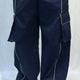 Relaxed, straight-fit navy blue pants with white piping on the sides. Cool and functional for any casual outing.
