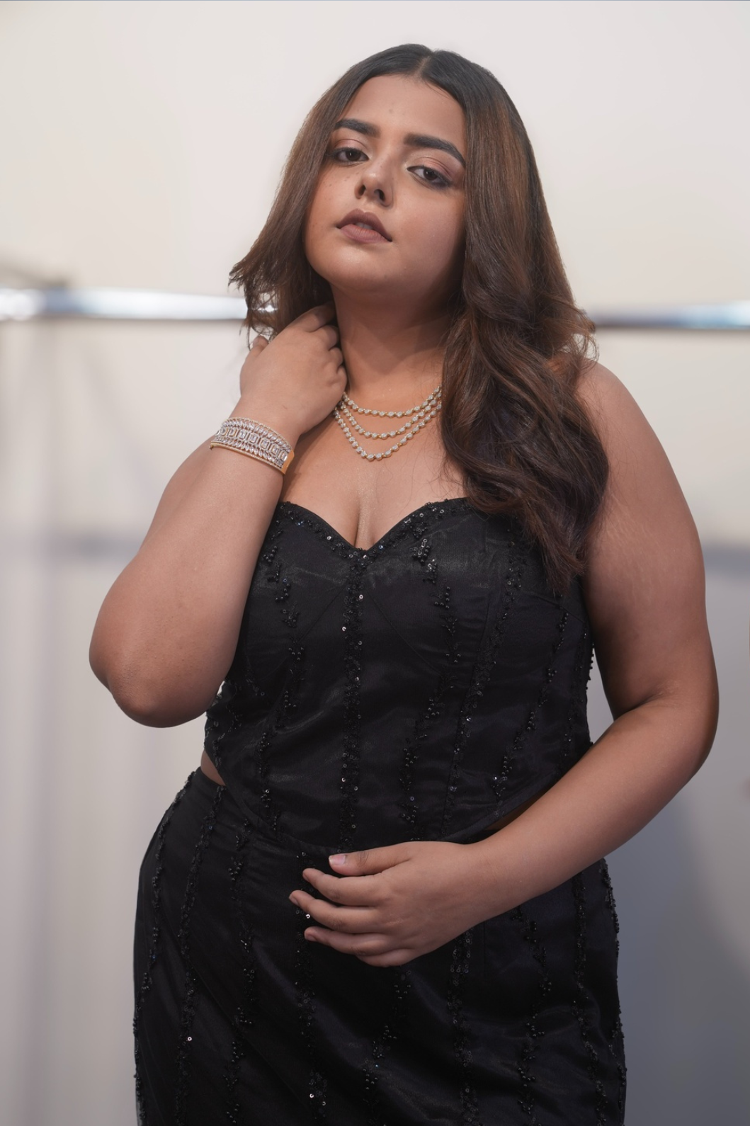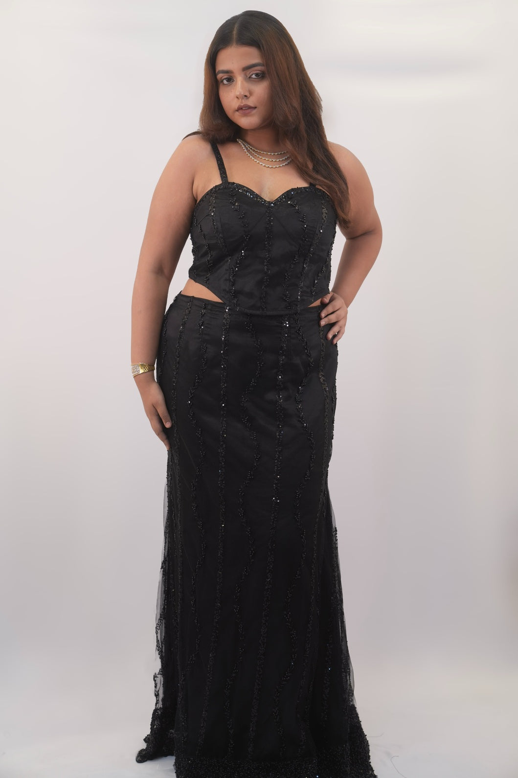 The sculpted corset showcases intricate threadwork, delicately hand-embellished and framed in luxurious black satin. It’s paired with our signature heavy mermaid skirt, adorned with exquisite threadwork and refined hand embellishments for a statement look.