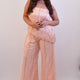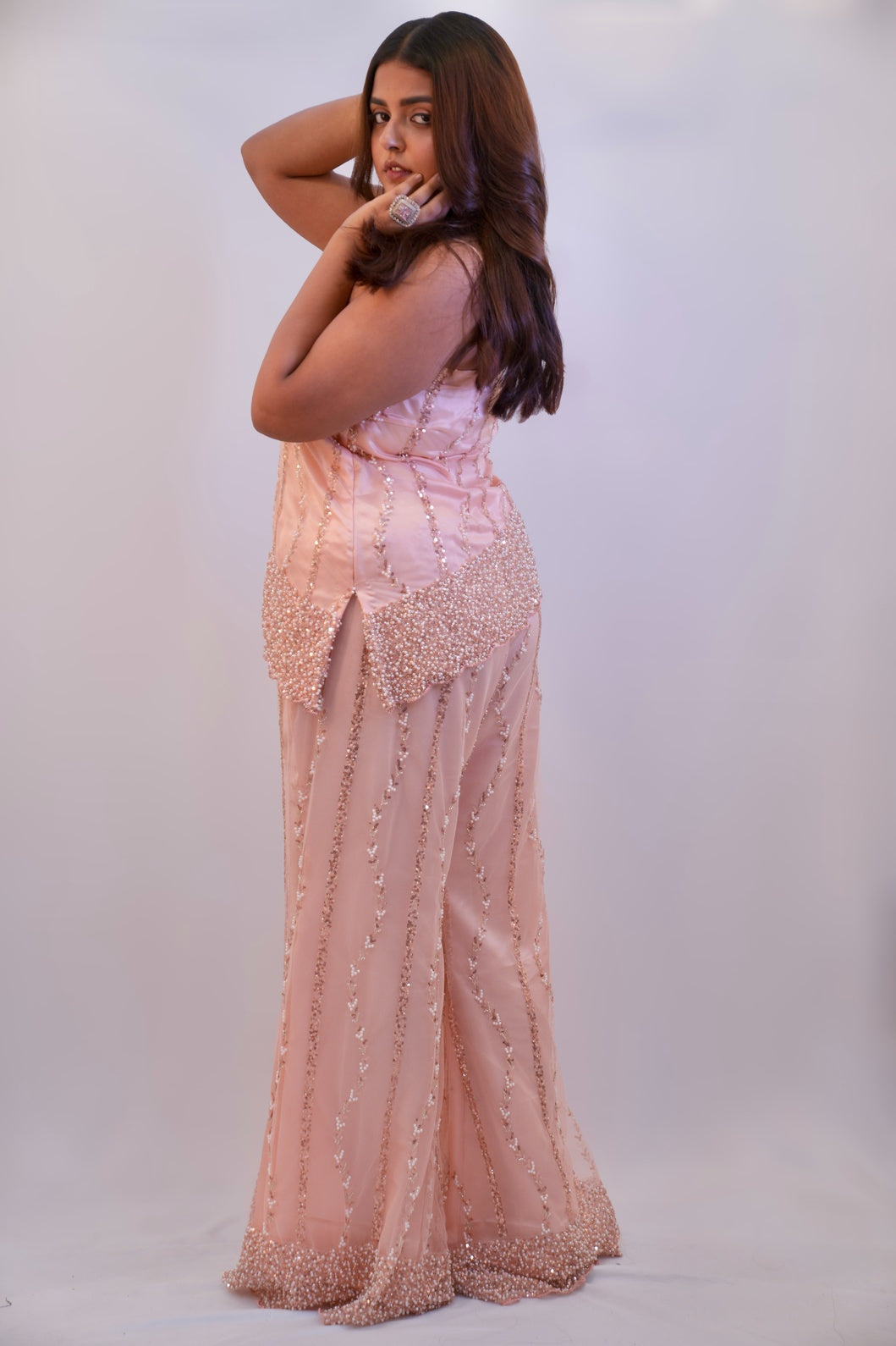 A classic sharara with y2k twist, features intricate threadwork, delicately hand- embellished and framed in net and luxurious blush pink satin.