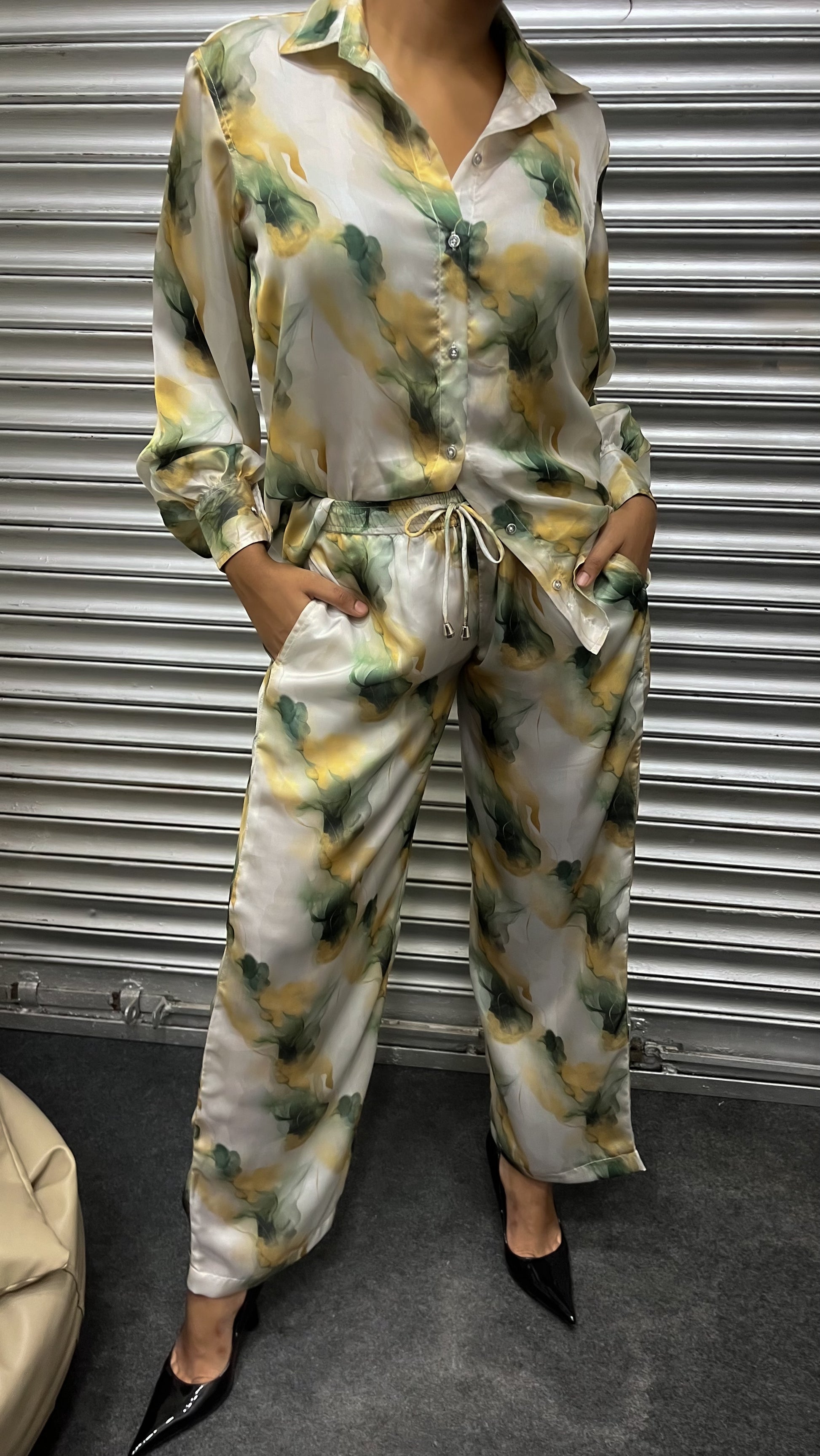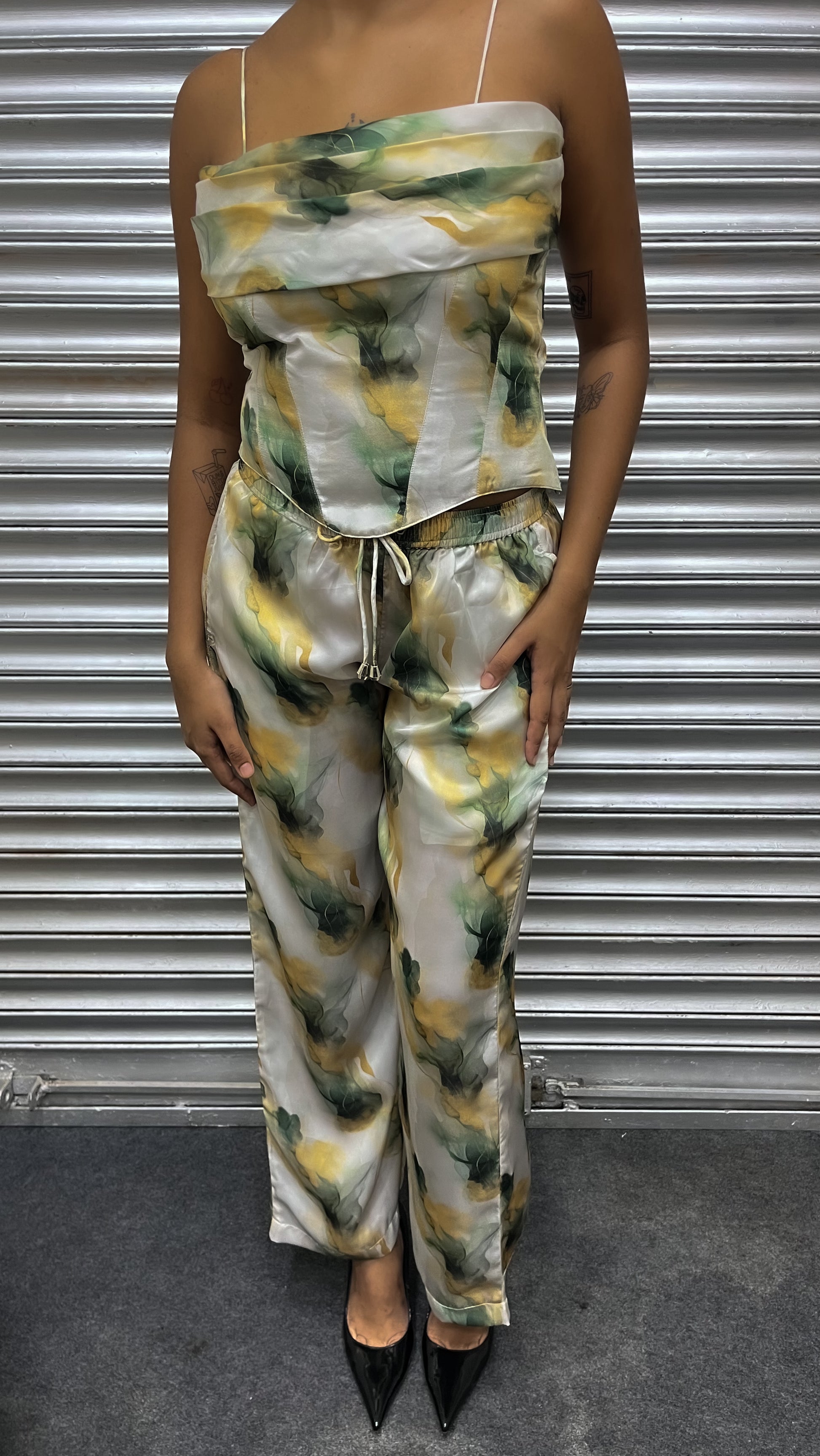 High-waisted, flowy pants with a soft floral print and drawstring waist, striking the perfect balance between comfort and elegance.